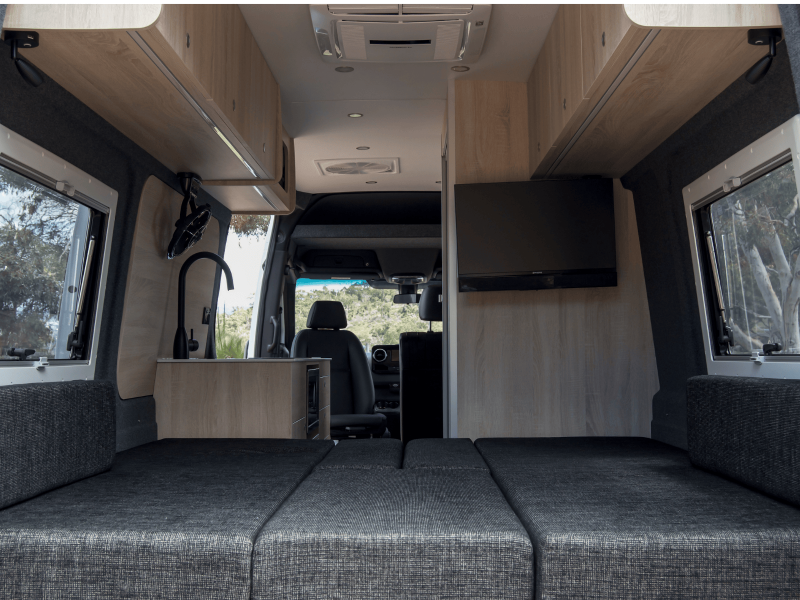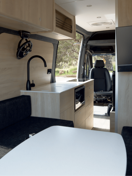Ausstattung: 2 Sitzplätze in der Fahrerkabine, Klimaanlage/Heizung, tragbare Doppel-Induktionskochplatte, Kühlschrank/Gefrierschrank (80 l), Frischwassertank (80 l), 12 V Campingdusche, Doppelbatterie, Energiemanagementsystem mit Steuerungsdisplay, Küchenutensilien, persönliche Ausstattung, Campingzubehör, Markise, Nespresso-Kaffeemaschine, Ventilator im Innenraum, Jalousien an Fenstern, Fliegengitter an Fenstern und Seitentür