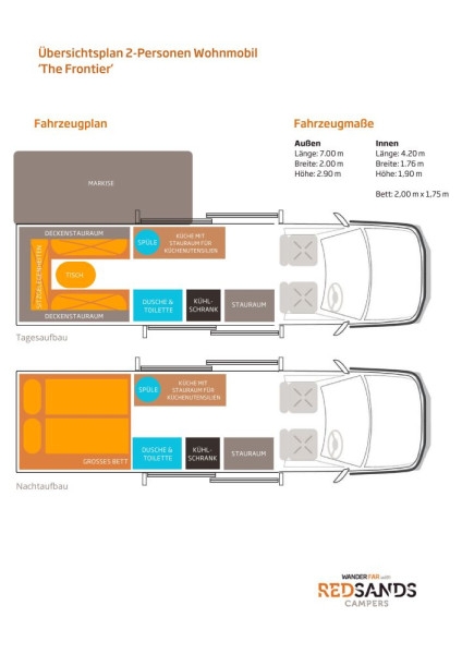 Ausstattung: 2 Sitzplätze in der Fahrerkabine, Klimaanlage/Heizung, tragbare Doppel-Induktionskochplatte, Kühlschrank/Gefrierschrank (150 l), Frischwassertank (38 l), Abwassertank (12 l), Küchenutensilien, persönliche Ausstattung, Campingzubehör, Markise, 3 Schiebefenster mit Fliegengittern